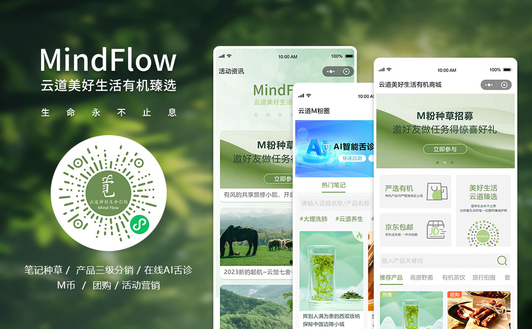 这背后是成都观道沟通文化传播有限公司为大理云道文化旅游发展有限公司精心策划开发的MindFlow云道美好生活有机臻选分销商城,一个融合了禅意生活、健康科技与微信社交裂变技术的创新平台。